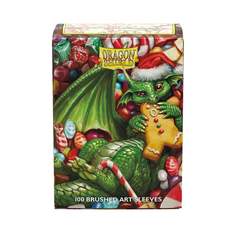 The 2024 Dragon Shield Christmas Brushed Art sleeves feature mischevious dragons endulging in seasonal sweets.