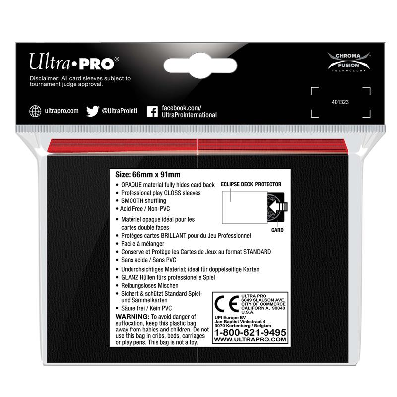 See foiled and holographic cards in a new light with Ultra PRO's Eclipse Gloss sleeves. Ultra PRO's exclusive ChromaFusion technology ensures fully opaque back. With superior durability balanced with excellent shuffle-feel, these Deck Protectors sleeves are ideal for tournament use.