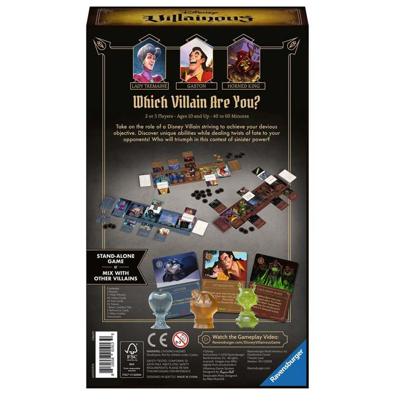 In Villainous: Despicable Plots, each player takes control of one of three Disney characters, each one a villain in a different Disney movie, specifically Lady Tremaine (Cinderella), the Horned King (The Black Cauldron), and Gaston (Beauty and the Beast).
