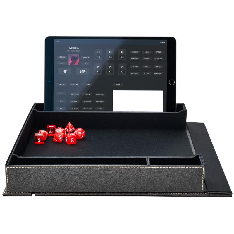 Do you use digital character sheets on a mobile phone or tablet? Use the included foam blocks and place it in the miniature compartment to rest at the perfect viewing angle while playing. The Companion can be folded if table space is tight.
