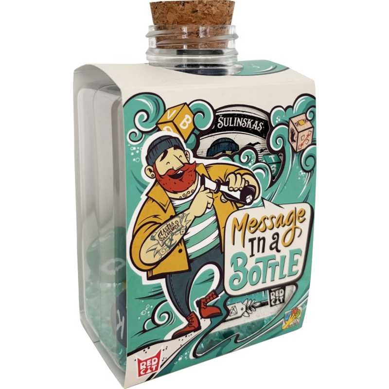 Message in a Bottle is a party game with an important deductive component. Created by Urtis Šulinskas and illustrated by Natalya Efremova, it comes with a bottle containing a message (the rules) and a handful of components. The game is super quick and super simple: it can be explained in three lines.