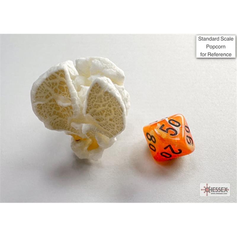 Contiene 7 dadi Vortex Arancione con numeri neri nelle seguenti forme: