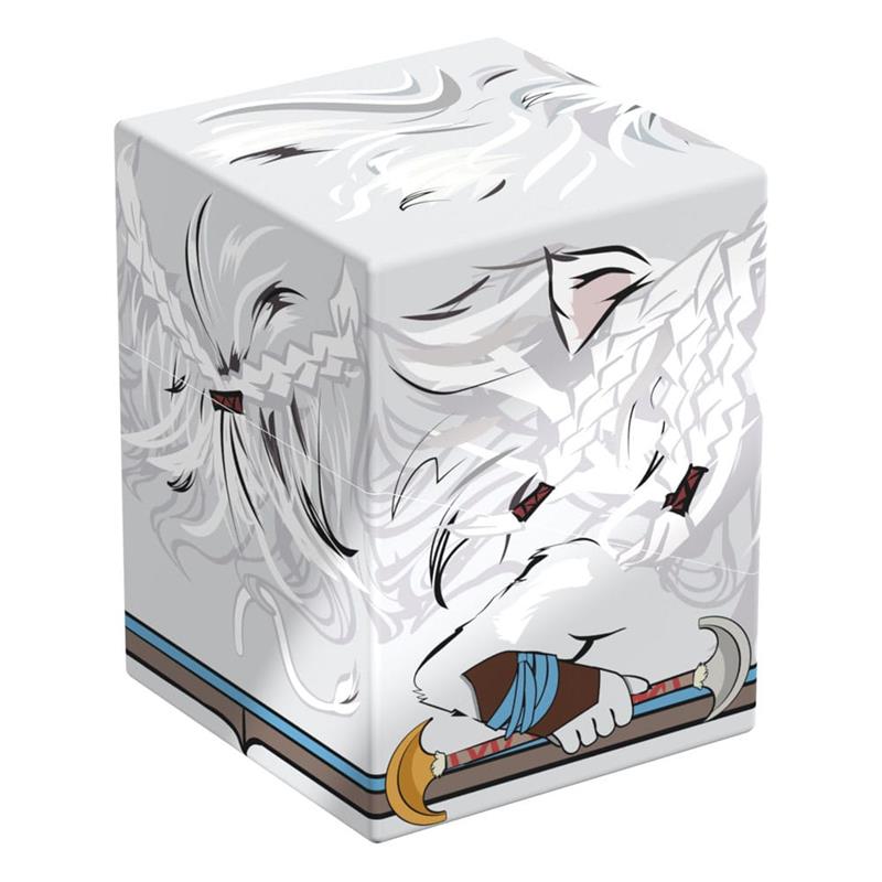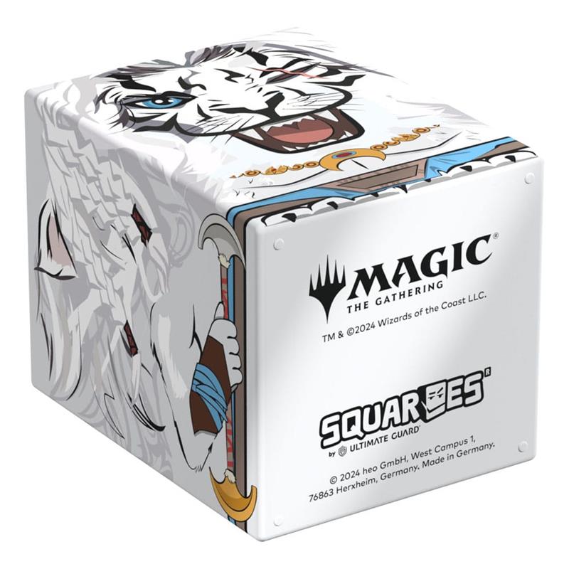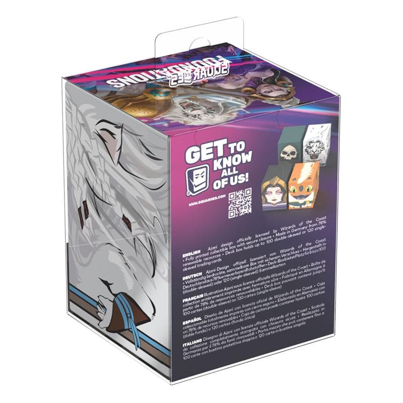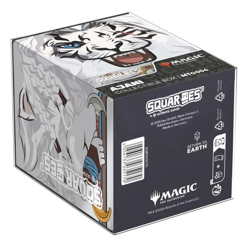Collectible box for storing your deck, tabletop gaming accessories, and/or collectibles. The Ajani Squaroe from the Magic: The Gathering edition holds up to 100 cards in double protective sleeves if used as a deck box. Squaroes are made from 78% renewable resources.