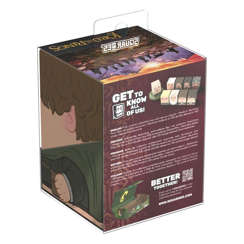 Collectible box for storing TCG decks, tabletop gaming accessories, and/or collectibles. The Sam Squaroe from the The Lord of the Rings edition holds up to 100 cards in double protective sleeves if used as a deck box. Squaroes are made from 78% renewable resources and fit perfectly into the separately available Collectors Case.