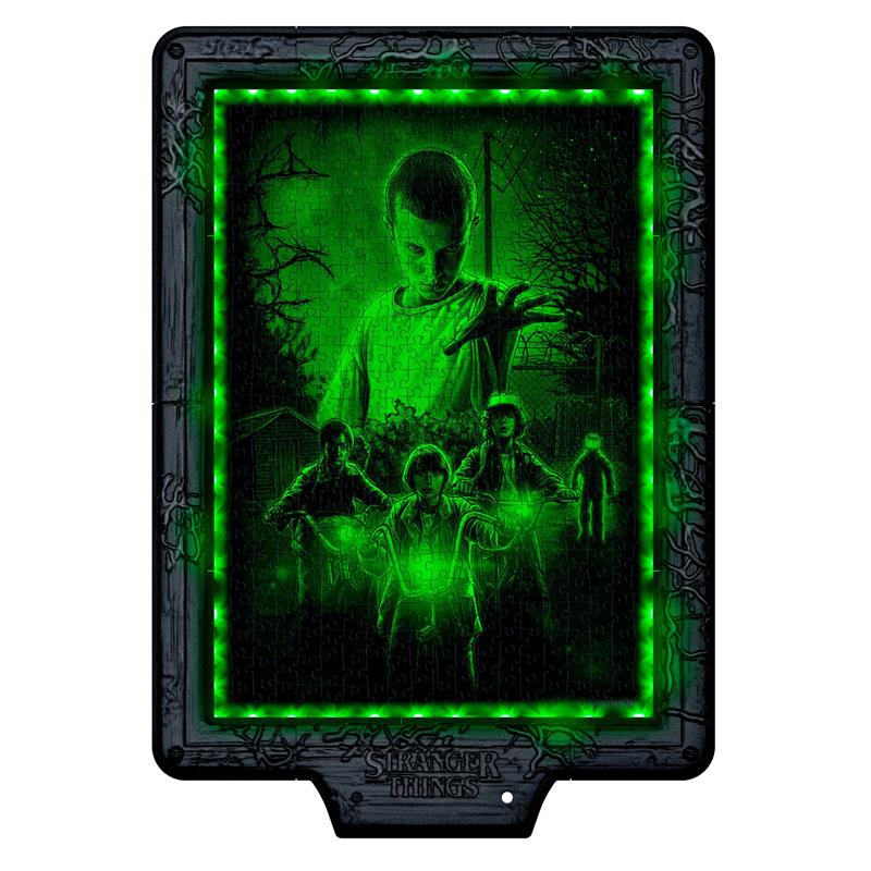 The product includes: 520-piece puzzle (49 x 36 cm), rigid cardboard, glue sachet, frame to assemble, electronic module, RGB LED strip, reference poster, and instruction manual.