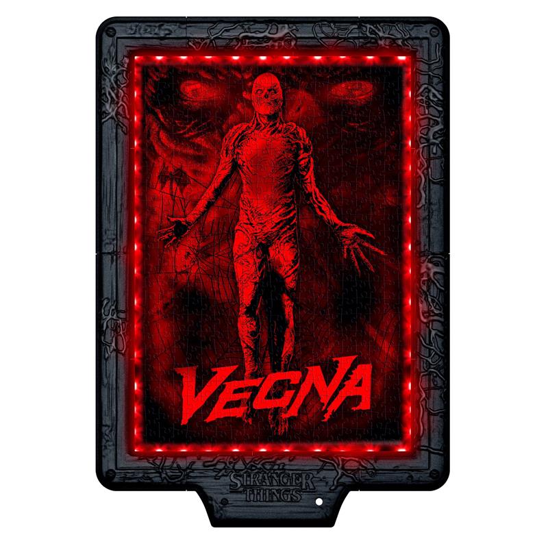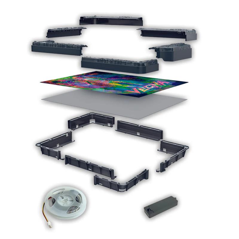 The product includes: 520-piece puzzle (49 x 36 cm), sturdy cardboard, glue sachet, frame to assemble, electronic module, RGB LED strip, reference poster, and instruction manual.