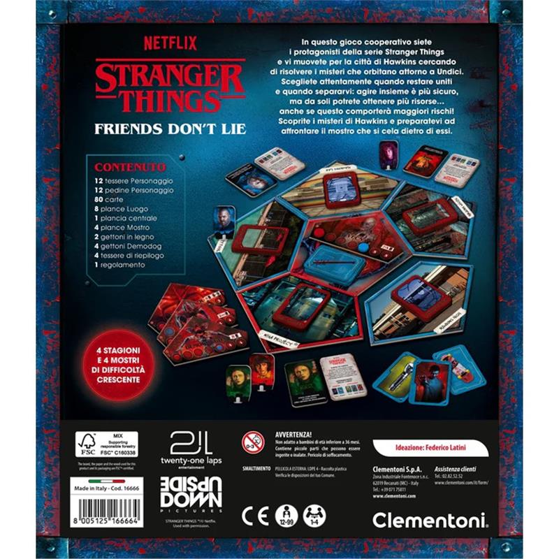 The game includes: 8 location decks with quality playing cards, 9 cardboard boards to recreate Hawkins, 12 character sheets and the corresponding token, and 4 monster boards.